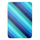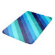 A large sized bath mat featuring a cool pattern design of diagonal stripes in navy blue, cobalt blue, sky blue, icy mint teal, and light turquoise.