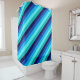 A shower curtain featuring a cool pattern design of diagonal stripes in navy blue, cobalt blue, sky blue, icy mint teal, and light turquoise.