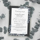 Greenery memorial service invitation with greenery and berry twigs in different shades of cool grey against a matte black background with black text against a white page with the greenery framing the memorial service invitation wording. Dark grey memorial service invitation without photo with leafy twigs framing the wording. Perfect for a winter memorial service or a man's memorial service.