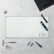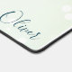 This desk mat features a right-offset dark teal scripted name on an icy pale green ethereal bokeh galaxy background.