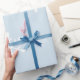 This trendy and stylish Christmas wrapping paper features a soft, light blue background, with festive white snowflakes.