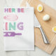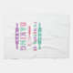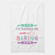 A cute kitchen towel for the baker in your life with "I'd rather be baking" in a fun retro font with illustrations of rolling pins and a whisk in pink, purple and teal.