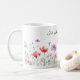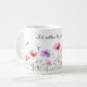 Beautiful watercolor flowers border this mug. For seasonal home decor, mugs are an easy change from cosy winter to a colourful spring aesthetic. Text can be changed. AI assisted graphic purchased with commercial license. Artwork: MokoDE