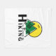 This fleece blanket is perfect for a hiking enthusiast. The graphic consists of mountains with a sun in the background and prints of hiking boots across the mountains with the words " I'd Rather Be Hiking" below.