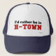 I'd Rather Be In H-Town! Are you from Houston, Texas? Do you have a friend or family member who loves Houston, Texas? If so, this "I'd Rather Be In..." hat is what you're looking for! The design features "I'd rather be in" in small black lettering at the top and "H-Town" in big red lettering at the bottom.