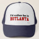I'd Rather Be In Hotlanta! Are you from Atlanta, Georgia? Do you have a friend or family member who loves Atlanta, Georgia? If so, this "I'd Rather Be In..." hat is what you're looking for! The design features "I'd rather be in" in small black lettering at the top and "Hotlanta" in big red lettering at the bottom.