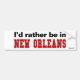 I'd Rather Be In New Orleans! Are you from New Orleans, Louisiana? Do you have a friend or family member who loves New Orleans, Louisiana? If so, this "I'd Rather Be In..." bumper sticker is what you're looking for! The design features "I'd rather be in" in small black lettering at the top and "New Orleans" in big red lettering at the bottom.