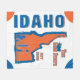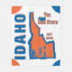 The Idaho design features an illustration of a potato sack cartoon character hanging out on typography reading Idaho's nickname, "The Gem State", a silhouette of the skyline of Boise, and Idaho's statehood year.