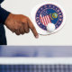 Badge of Idaho with flag of Idaho and flag of USA colours, rounded shape.
