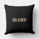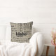 A charming pillow featuring the state name of Idaho and some of its cities and towns in black text of varying fonts and sizes on a taupe/grey background. The back is solid black with the word "Idaho" in taupe. Just flip the pillow to quickly change out the look of your room.