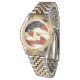 The watch is very nice, the picture is great and the watch looks like quality. The only problem I am having with it is that it is a little too large, and I also can't figure out how to open the clasp. No directions came with it. Very good. The printing is perfect and the watch keeps good time.
