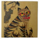 A ‘Minhwa’ represents Korean folklore created by unknown artists over centuries. The tiger is a figure associated with the Korean culture and an ugly or misshapen animal can represent foolish or corrupt aristocrats according to legend. This minhwa depicts a striped tiger scolded by a magpie.
