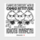 A humorous and sarcastic black-and-white graphic design showcases three bird silhouettes perched on a branch, each with big, expressive eyes. The black handwritten text reads, "I wake up every day with a good attitude and then idiots happen." This design is available on a variety of products, making it a perfect gift for bird lovers and fans of sarcastic humor.