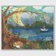 a picturesque evening scene of fox sleeping and an owl out for the night on a tree branch overlooking a moonlit river with origami boat; you can see fish just below the surface of the water and bears on the horizon. Illustration by becky nimoy 2018