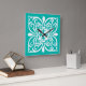 Digital reproduction of a damask medallion pattern with a striated, Ikat woven texture - creamy white on a turquoise / peacock blue background