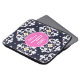 A gift which can be personalised with your monogram inside pink circle at centre. Background is navy blue and white ikat pattern.