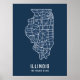 Graphic and simple poster with Illinois State map with its main roads on an navy blue background.