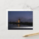 Postcard of illuminated historic windmills with reflection in the water of the river during the Blue Hour at the beginning of the night in Kinderdijk in the Netherlands with a fading bar and the text: 'Netherlands'.