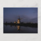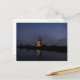 Postcard of illuminated historic windmills with reflection in the water of the river during the Blue Hour at the beginning of the night in Kinderdijk in the Netherlands.