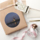 Round photo sticker with illuminated historic windmills with reflection in the water of the river during the Blue Hour at the beginning of the night in Kinderdijk in the Netherlands.