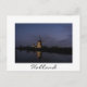 Postcard of illuminated historic windmills with reflection in the water of the river during the Blue Hour at the beginning of the night in Kinderdijk in the Netherlands with a white border and the text: 'Holland'.