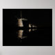 Poster of the famous windmills of Kinderdijk on a row along the canal with reflection in the water, illuminated in the dark night, creating a surreal scene in the Netherlands. Great decoration on your wall!