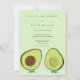 A vertical wedding invitation with a touch of fun. Be represented by two happy avocado half illustrations, who are deeply in love. This invitation mixes a whimsical joy with enough elegance that you can design your wedding however you like. The invite is done in shades of green. Place your names and information on this invitation, add it to your cart, and have a wonderful wedding.