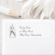 Simple pencil sketch illustration of the back of a bride and groom in front of a cross with two wedding rings.