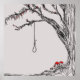 Illustration of a hangman's noose just hanging on from tree with red mushrooms at the base of the tree.