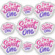 Adorable pink and purple "I'm a Sweet One" sticker sheet featuring 9 vibrant designs — perfect for first birthday party favours, invitations, thank you cards, or treat bags.