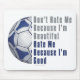 Futbal Art Don’t Hate Me Because I’m Good t-shirts, gifts, and accessories created by ITD Sports Centre feature our original artwork of half a blue and white futbal ball on the left side with the words in grey and blue on the right, Don’t Hate Me Because I’m Beautiful, Hate Me Because I’m Good. Our fun and competitive sporting goods are great gifts for soccer lovers, fuybal lovers, soccer players, soccer stars, soccer coaches, athletes, and sports lovers of all ages. It’s all fun and games at Imagine That! Design Sports Centre!