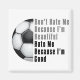 Soccer Art Don’t Hate Me Because I’m Good t-shirts, gifts, and accessories created by ITD Sports Centre feature our original artwork of half a black and white soccer ball on the left side with the words in black and white on the right, Don’t Hate Me Because I’m Beautiful, Hate Me Because I’m Good. Our fun and competitive sporting goods are great gifts for soccer lovers, football lovers, soccer players, soccer stars, soccer coaches, athletes, and sports lovers of all ages. It’s all fun and games at Imagine That! Design Sports Centre!