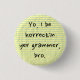This round button design shows a lined, slightly crumpled yellow notebook page with the misspelled words, "Yo, I be korrectin yer grammer, bro." It's for sarcastic people who get sick of all the anal-retentive, passive-aggressive grammar snobs who are always "silently correcting your grammar." Whether you're a writer who is tired of your editor's line edits or you just like to make English professors angry, this is the button for you, bro.