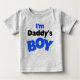 I'm Daddy's Boy T-shirts, long sleeve tees, bodysuits including organic bodysuits, and football bodysuits, hats, rompers, dark T-shirts, raglan T-shirts, and other apparel with a bright blue and black text design that reads I'm Daddy's Boy!