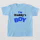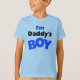 I'm Daddy's Boy T-shirts, long sleeve tees, bodysuits including organic bodysuits, and football bodysuits, hats, rompers, dark T-shirts, raglan T-shirts, and other apparel with a bright blue and black text design that reads I'm Daddy's Boy!