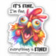 This funny chicken sticker will bring a smile to your face every time you see it. Featuring a cute chicken with the words "It's Fine, I'm fine, everything is FINE", this sticker is perfect for sticking on laptops, water bottles, or notebooks. Spread some humour and positivity with this unique design.