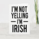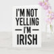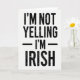This card features a crisp white background with large black all-caps lettering that reads “I’M NOT YELLING - I’M - IRISH” across three centered lines, giving the message a confident, cheeky presence ☘️. The type is a simple sans-serif style, with hyphens acting like little pauses that make the line breaks feel deliberate and punchy. The black letters have a worn, speckled texture, with tiny white flecks and slightly rough edges that suggest an older print pulled from a well-loved shop window. That weathered look softens the strong statement, like a friend grinning as they tease you rather than raising their voice 💚. With no characters or scenery competing for attention, the empty white space around the words feels like a spotlight on the joke. The layout stays tightly centered, keeping your eye moving from the first line to the last in a neat vertical stack. The final detail you notice is the distressed pattern inside the thick black strokes, where the white specks break up the ink like gentle wear across each letter.