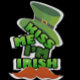 A digital illustration on a black background features a St. Patrick's Day theme. At the top, a green leprechaun hat with a black band and gold buckle is tilted slightly to the right. Below the hat, the words "KISS ME I'M IRISH" are stacked in white block letters with a green fill. Underneath the text, a brown moustache with curled ends is displayed. The illustration has a clean, cartoonish style with bold outlines and flat colours, giving it a playful and festive appearance.