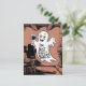 Halloween greeting card featuring a ghost with a glass of wine, smiling mischievously.