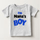 I'm Nana's Boy T-shirts, long sleeve tees, bodysuits including organic bodysuits, and football bodysuits, hats, rompers, dark T-shirts, raglan T-shirts, and other apparel with a bright blue and black text design that reads I'm Nana's Boy!