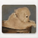 Sad Golden Retriever pup in washtub.