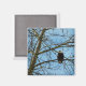 A photograph of a Bald Eagle perched in a tree, with a stern look, watching what is happening below the tree branches.
