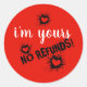 Have a little fun this Valentines Day with the "I'm yours NO REFUNDS!" sticker. This sticker has a red background and white script text that reads "I'm yours". In a playful, black bold text are the words, NO REFUNDS! This design also has three black paint splattered hearts.
