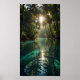 Image is a vibrant, serene tropical scene. photo from low angle point of view., from the front of the kayak. The layout is a symmetrical composition with a yellow kayak canoe in the foreground, leading the viewer's eye into the lush, verdant jungle. The water is a deep, clear turquoise, reflecting the surrounding greenery. Towering palm trees and dense foliage frame the scene, with sunlight filtering through the leaves and morning mist, creating god rays, creating dappled patterns on the water. The atmosphere is tranquil and immersive, capturing the essence of a secluded, untouched paradise.