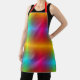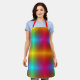 Image shows a colourful apron with a vibrant rainbow gradient and red straps. It is displayed flat and worn by a smiling person in a light outfit.