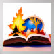 A magical pop-up scene unfolds from an open book, revealing mountains, a radiant sunset, and colorful trees. This imaginative display symbolizes storytelling, creativity, and nature-inspired wonder in a playful format.