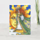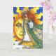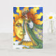 Imbolc Greeting Card. Brigit stands in front of the sun while a tender shoot of green grass peeks through the snow showing the promise of spring. In her dark green cloak are the blossoms of the upcoming spring. Eight candles adorn her green crown representing the eight pagan holidays.
