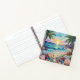 Pretty seaside coastal personalized Notebook with a gorgeous ai impasto oil painting style illustration of blue ocean waves crashing on a sandy beach, that is covered in sea glass and surrounded by palm trees at sunset and sunrise.