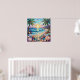 Pretty seaside coastal poster with a gorgeous ai impasto oil painting style illustration of blue ocean waves crashing on a sandy beach, that is covered in sea glass and surrounded by palm trees at sunset and sunrise.