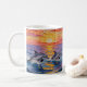 An ai impasto style dolphins swimming with a pink, orange and purple sunset over the ocean . A beautiful coastal coffee cup to add a beachy touch to your drinkware.